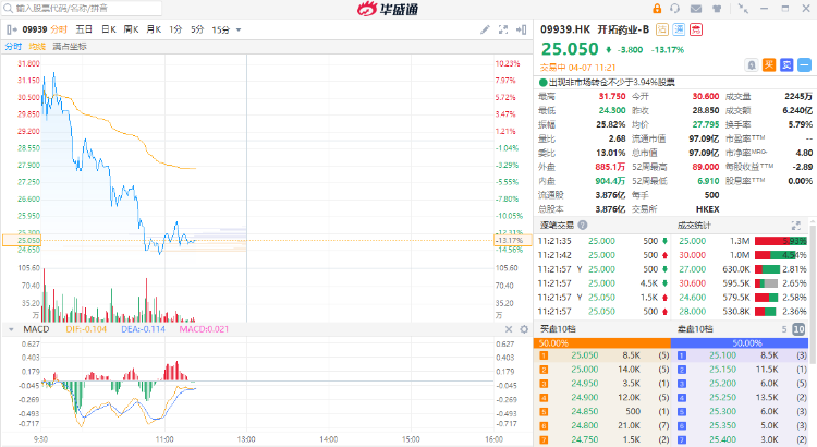 华盛资讯4月7日消息,港股开拓药业高开低走,下挫转跌13%,此前涨超10%,现报25.05港元每股,成交额6.24亿港元,市值接近百亿。该股昨日收涨106.37%,报28.85港元。