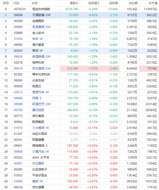科网股涨跌互现,美团涨2.67%,报165.2港元每股,小米微涨0.15%。网易、阿里、腾讯转跌,京东微跌1.11%,刘强东宣布辞任京东CEO;B站、快手跌逾1%,百度跌2.66%。