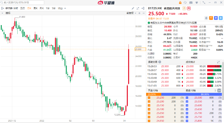 华盛资讯4月7日消息,港股香港航天科技再度拉升涨超40%,4个交易日累计涨幅超90%,现报25.5港元,总市值78.8亿港元。