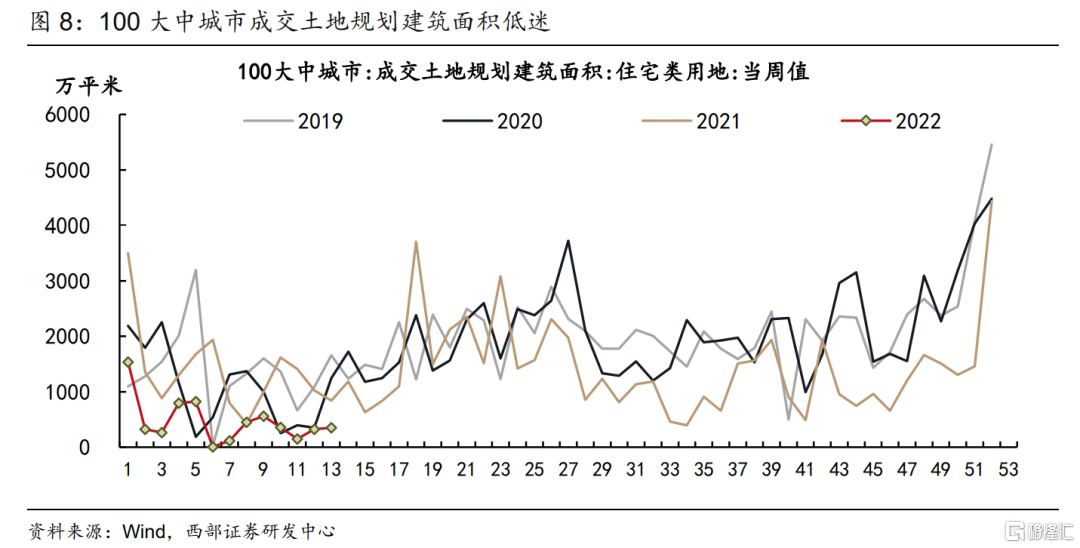 从土地供应端看,住宅类成交土地面积较往年偏低。从全国100个大中城市的住宅类成交土地规划建筑面积看,今年一季度,大多数时期的周度成交面积均低于过去三年的同期水平,说明企业拿地意愿不强。受此影响,住宅类成交土地溢价率较往年明显下滑。全国100个大中城市住宅类成交土地溢价率均在5%以下,而过去三年同期的溢价率基本维持在10%~30%的区间内。