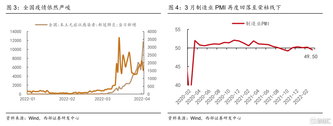 国内疫情扰动经济运行。进入3月以来,全国疫情出现多点散发态势,吉林、上海新增病例数持续增加。根据国家卫健委数据,从3月1日截止4月3日,全国新增确诊病例46618例,新增无症状感染者98378例。受疫情冲击较大的上海,采取动态清零政策,实施划区域封控,全民核酸筛查。线下消费基本暂停,线上经济也因运力不足而受到严重冲击。作为国家经济中心城市,承载着金融、贸易、航运和科技等重要职能,疫情的持续增加了进一步波及其他经济链条的风险。