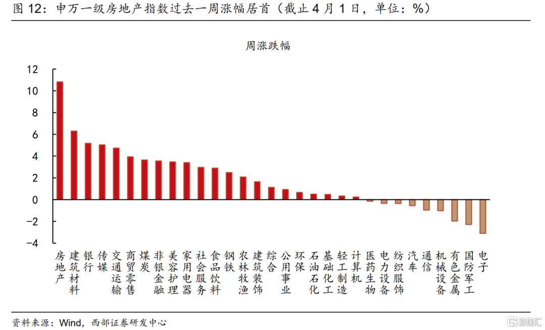 房地产行业指数(申万一级行业,下同)表现明显优于其它宽基指数。截止4月1日,房地产指数近一周涨幅录得10.82%,跑赢上证综指(2.19%)、中小板指(0.99%)、创业板指(1.10%)和科创50指数(-1.60%);从3月度数据看,房地产指数涨3.26%,同期上证指数、中小板指、创业板指和科创50指数涨跌幅分别为0.94%、1.16%、0.28%、-0.17%,房地产指数依然占优;从年初至今表现来看,房地产涨10.77%,大幅跑赢上证指数(-9.81%)、中小板指(-17.70%)、创业板指(-19.73%)和科创50指数(-22.10%)。