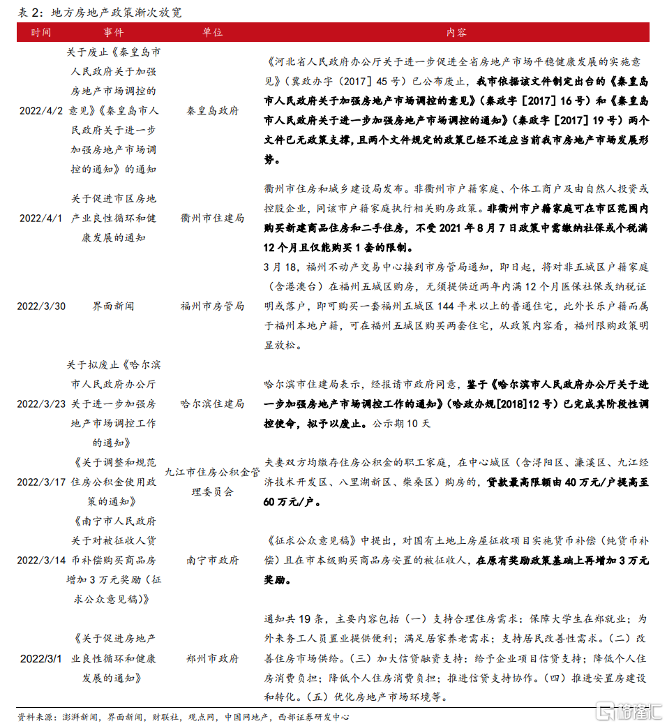 政策放松的力度有逐步增强的趋势。3月1日,郑州市新政19条为例,政策内容涵盖购房资格、加大信贷支持等;3月18,福州不动产交易中心接到市房管局通知,即日起,将对非五城区户籍家庭(含港澳台)在福州五城区购房,无须提供近两年内满12个月医保社保或纳税证明或落户,即可购买一套福州五城区144平米以上的普通住宅,此外长乐户籍而属于福州本地户籍,可在福州五城区购买两套住宅,从政策内容看,福州限购政策明显放松。4月1日,浙江省衢州住房和城乡建设局发布通知,非衢州市户籍家庭、个体工商户及由自然人投资或控股企业,同该市户籍家庭执行相关购房政策。非衢州市户籍家庭可在市区范围内购买新建商品住房和二手住房,不受2021年8月7日政策中需缴纳社保或个税满12个月且仅能购买1套的限制,此举被认为是对限售政策的全面放开。
