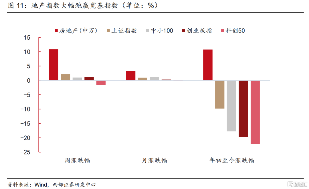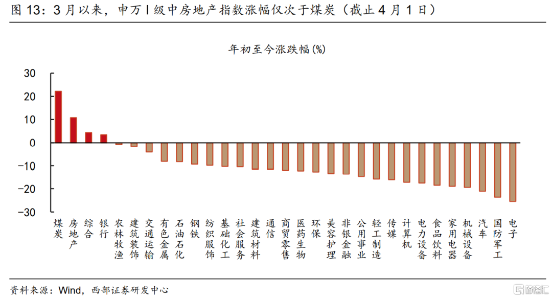 政策放松预期驱动指数上扬。年初至今,房地产指数涨10.77%,大幅跑赢上证指数(-9.81%)、中小板指(-17.70%)、创业板指(-19.73%)和科创50指数(-22.10%)。对比其他行业,房地产近期表现依然占优。年初至今涨幅,位居申万I级行业次席,仅次于煤炭。国务院金稳会后政策预期持续强化。3月16日,金委会专题会释放积极信号;财政部负责人表示今年不具备扩大房地产税试点城市的条件,受此影响,房地产指数持续上扬。