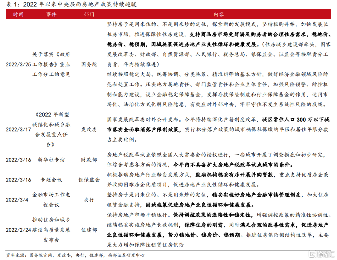 2022年以来,房地产政策与表态频出,政策整体上围绕“稳地价、稳房价、稳预期”的总基调,坚持“因城施策”总体方针。通过对政策时间线的梳理,我们认为,国务院及各部委对于房地产行业的政策呈现边际放松的态势。