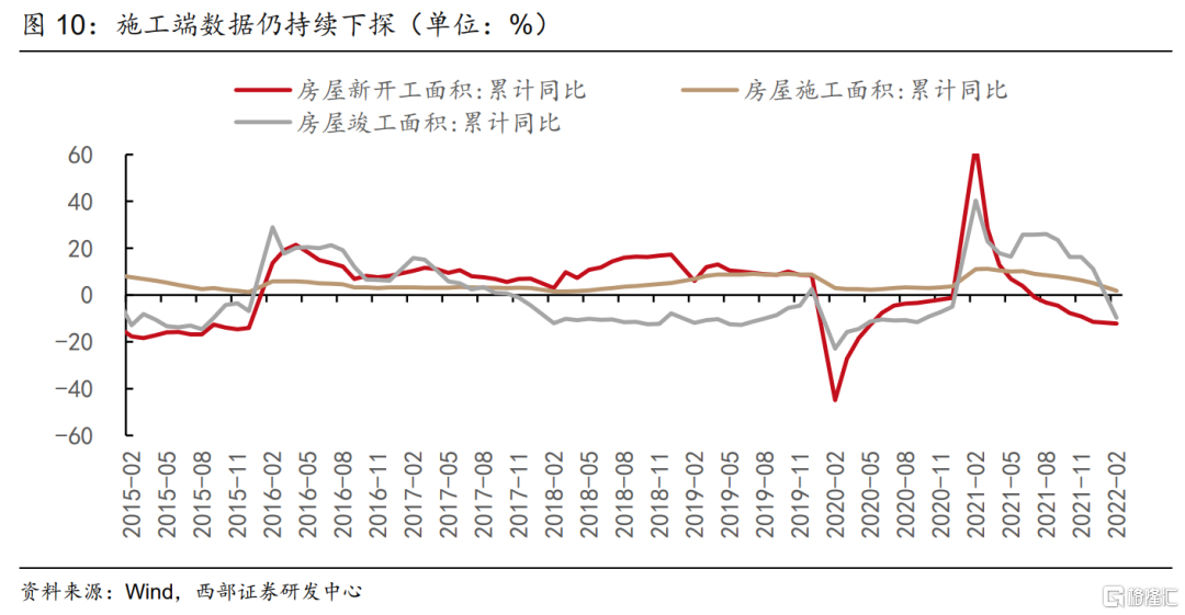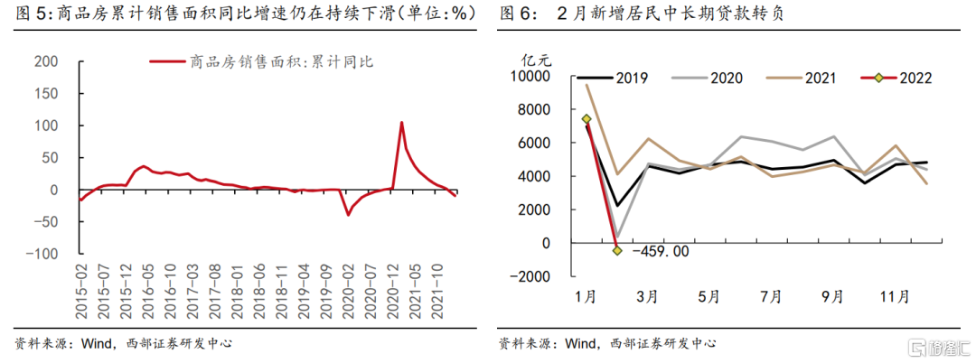 地产需求端下行拐点仍未显现。从销售端的数据看,今年2月商品房销售面积累计同比降-9.6%,增速由正转负,延续下滑态势。对应地,2月新增居民中长期贷款为-459亿元,2007年来首度录得负值。新增居民中长期中主要包含了居民按揭贷款,单月数据的持续下行反映了需求疲软的现实。一方面,在“房住不炒”长效机制的调控下,地产投机需求被持续打压,房价升值预期转弱,短期内重拾难度较大;而另一方面,对刚需住房者而言,由于经济预期转弱,叠加看跌预期,在政策刺激不大的情况下,仍不能形成有效需求。