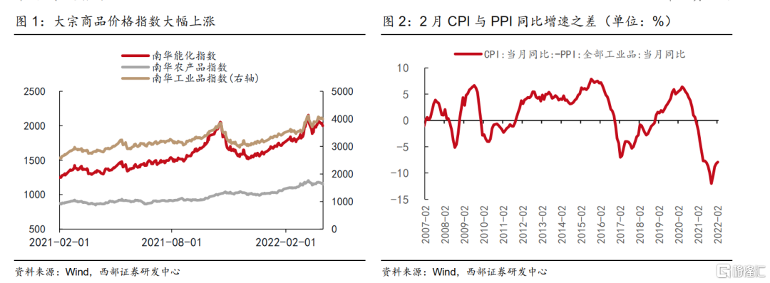 俄乌冲突抬升全球大宗商品价格。2月24日,俄乌冲突爆发,刺激能源、工业金属及农产品等大宗商品大幅上涨,受此影响欧美经济体通货膨胀抬升,经济面临衰退风险。国内方面,上游工业原材料价格也出现大幅上涨,一季度,南华能化指数、南华化工指数、南华农产品指数分别上涨24.5%、24.6%、14.7%,在国内需求偏弱的格局下,CPI-PPI同比增速之差或将拉大,中下游企业成本压力明显增加。