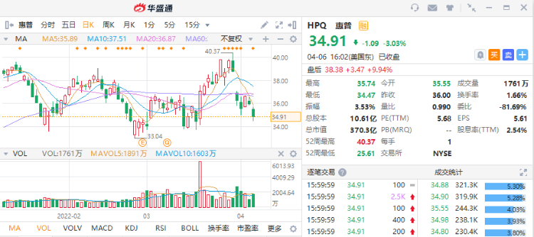 - 惠普去年累计涨幅达53.19%,今年年内累计跌幅超8%,与美股大盘表现几乎同步。业绩表现上,惠普公布的2022年第一季度数据显示,Q1每股收益为1.1美元,超过0.99至1.05美元的预期,较此前四季度的0.94美元增长17.02%;该公司最新的股息收益率为2.56%。