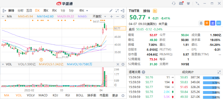 - 因特斯拉CEO马斯克入局,推特本周大涨。文件显示,马斯克从1月31日开始买入推特股票,至4月1日累计买入推特9.1%的股票(最新文件显示持股比例为9.1%),并从被动投资者转向了主动投资者,主动加入公司治理阵营。截至本周三收盘,推特本周累计涨幅已达29.15%。
