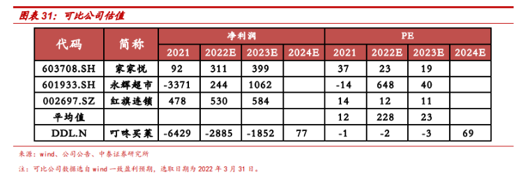 - 评级方面,中泰证券最新研报首次覆盖叮咚买菜,给出“增持”评级,选取家家悦、永辉超市、红旗连锁等生鲜赛道的成熟企业作为对比(见上图),预测前置仓模式2024年可跑通盈利;认为随着客单价、毛利率、履约成本的不断改善,叮咚买菜有望2024年实现盈利。去年四季度,叮咚买菜上海区域已实现盈亏平衡。