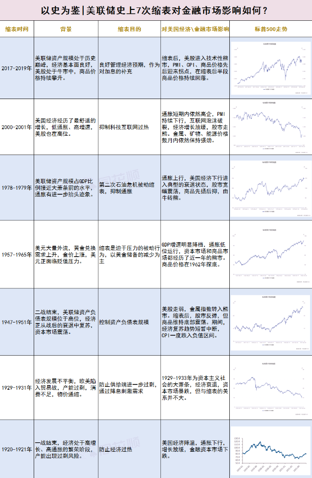 加息不足以让市场恐惧,但缩表则不得不警惕。回顾历史,美国自20世纪以来共经历了7次缩表,分别是1920-1921年、1929-1931年、1947-1951年、1957-1965年、1978-1979年、2000-2001年和2017-2019年。缩表出现的频率远低于加息,如20世纪70年代以后仅有两次缩表,加息则有7次。