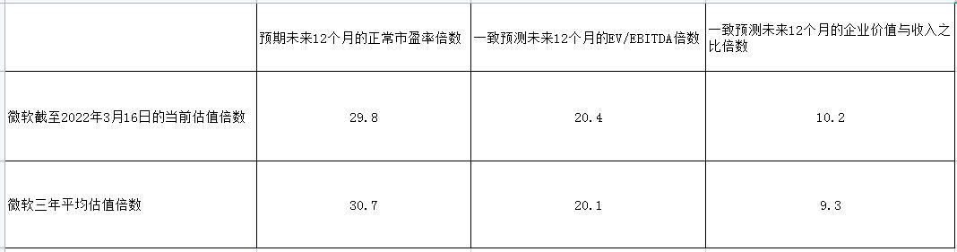 当我们将微软当前的估值指标与历史平均估值进行比较时,它的估值也是合理的。如下表所示,微软目前的估值倍数接近其三年平均值。