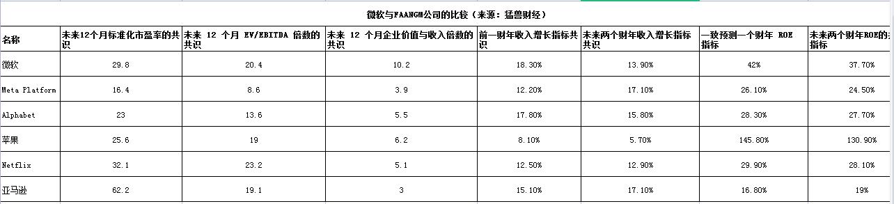 通过与其他FAANGM公司相比,微软的远期企业价值收入比、EV/EBITDA和标准化市盈率是合理的。