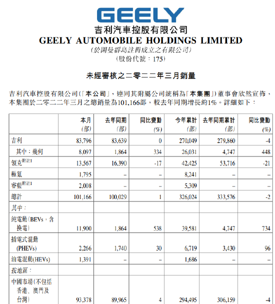 吉利汽车(00175.HK)发布公告,本集团于二零二二年三月之总销量为101,166部,较去年同期增长约1%。