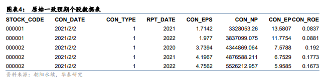 每日每只股票的一致预期数据个数可能是不同的,一般包含2-3个未来年份(通常有卖方持续覆盖的情况下,不论是否披露财报,均有3年预测期数据,财报更新后没有卖方持续跟踪的,有2年预测期数据)。当某年的财务报表披露后,该年的一致预期数据就不再出现,所以一致预期数据的预测年份是在变化的。如下图,在2021年2月2日,股票000002有三年的一致预期数据,而股票000001则只有两年的一致预期数据,这是由于股票000001的2020年财报已披露,最小预测年份就会变成2021年,而股票000002的2020年财报尚未披露,故最小预测年份是2020年。