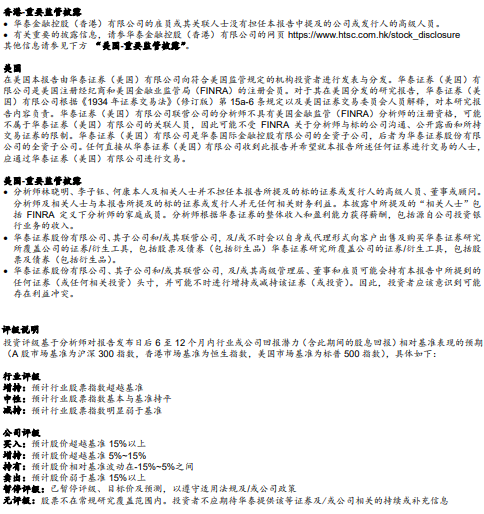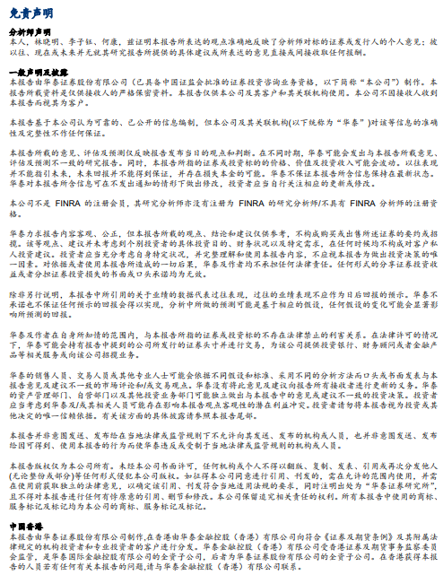 在任何情况下,本公众号中的信息或所表述的意见均不构成对任何人的投资建议。订阅者不应单独依靠本订阅号中的内容而取代自身独立的判断,应自主做出投资决策并自行承担投资风险。订阅者若使用本资料,有可能会因缺乏解读服务而对内容产生理解上的歧义,进而造成投资损失。对依据或者使用本公众号内容所造成的一切后果,华泰证券及作者均不承担任何法律责任。