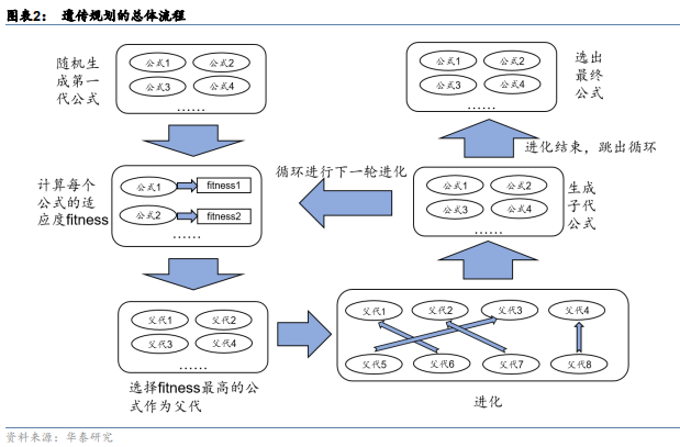 下图介绍了遗传规划的总体流程,遗传规划从随机生成的公式群体开始,通过模拟自然界中遗传进化的过程来逐渐生成契合特定目标的公式群体。我们对遗传规划程序包gplearn进行深度改进,实现了遗传规划在因子挖掘上的应用。关于遗传规划的详细原理,可参见报告《人工智能23:基于遗传规划选股因子挖掘》(2019.6.10)。