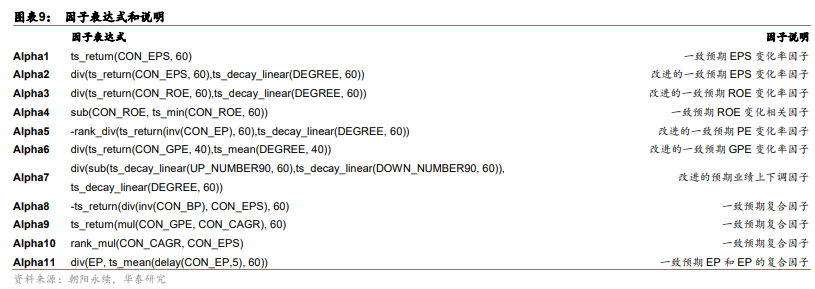3. 除了一致预期数据之间构建复合因子,一致预期数据也可以和真实的基本面数据构建复合因子。例如,Alpha11是一致预期EP和EP的复合因子,可将其视为基于一致预期EP的超预期因子。