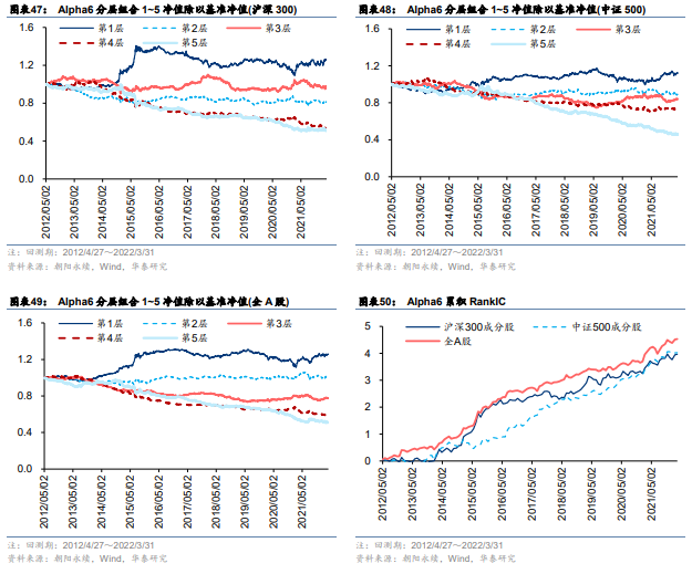 Alpha6 = div(ts_return(CON_GPE, 40),ts_mean(DEGREE, 40)),因子含义是一致预期GPE在过去40个交易日的变化率除以过去40个交易日分析师预测标准差的线性衰减加权值,该因子形式上与Alpha2类似,属于改进的一致预期GPE变化率因子。图表45~图表50为Alpha6的测试结果。