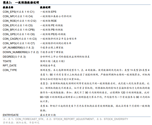 4. 一致预期数据中,可能会出现ENTRYDATE(入库日期)晚于TDATE(预测日期)的情形,我们针对此也进行了处理,避免使用未来信息。