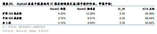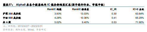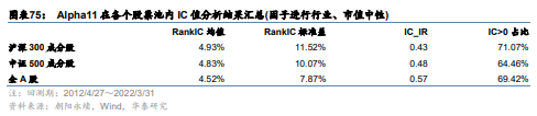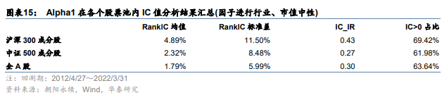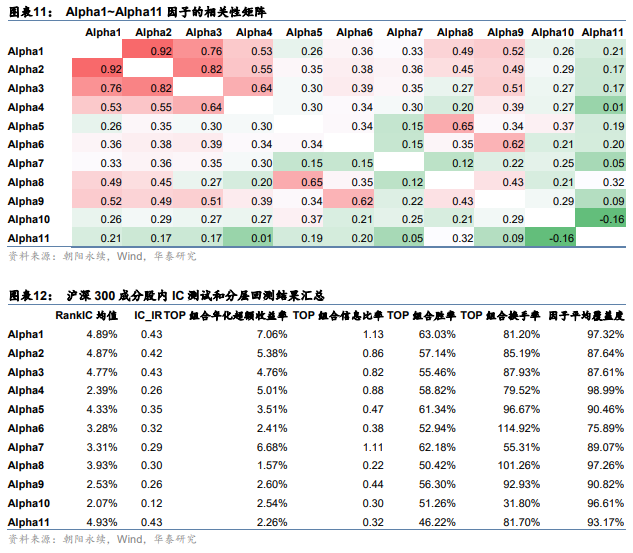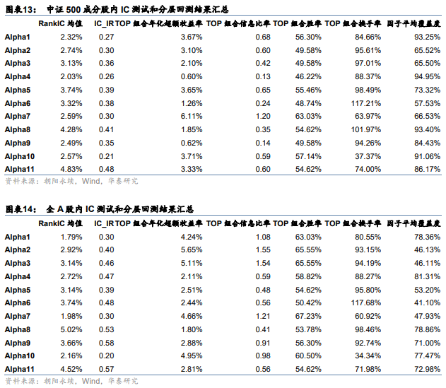 下图为Alpha1~Alpha11因子的相关性矩阵。可知Alpha1~Alpha4之间的相关性较高,实际上它们都是一致预期盈利变化相关的因子,其他因子间的相关性则较低。图表12~图表14为Alpha1~Alpha11在沪深300、中证500和全A股内的测试结果汇总。