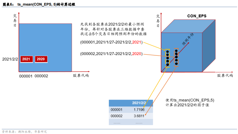 在构造好以上数据结构后,我们将通过一个简单的案例展示因子的计算方式。如图表6所示,以因子表达式ts_mean(CON_EPS,5)为例,计算过程为: