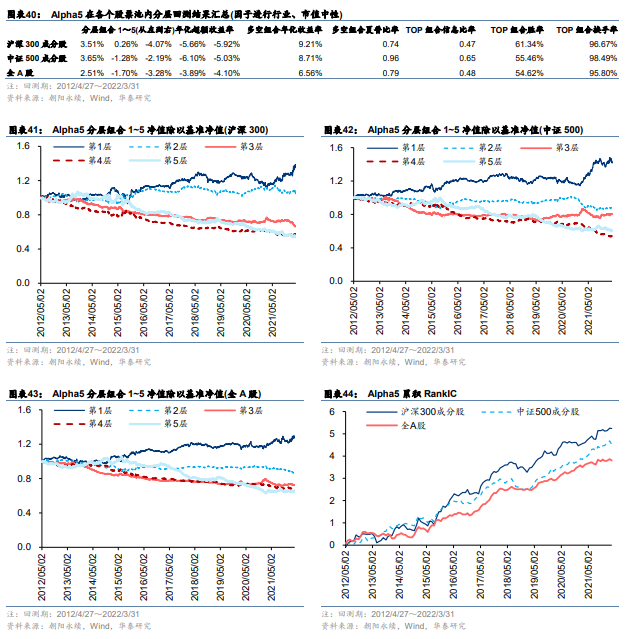 Alpha5=-rank_div(ts_return(inv(CON_EP),60), ts_decay_linear(DEGREE, 60)),因子先计算一致预期PE过去60个交易日的变化率和过去60个交易日分析师预测标准差的线性衰减加权值,再将二者的排序数相除并取相反数,本质上是一个改进的一致预期PE变化率因子。图表39~图表44为Alpha5的测试结果。