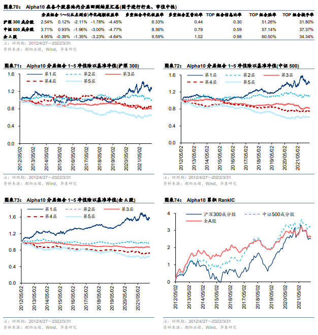 Alpha10 = rank_mul(CON_CAGR, CON_EPS),因子计算一致预期净利润2年复合增长率和一致预期EPS排序数的乘积。该因子属于一致预期复合因子。图表69~图表74为Alpha10的测试结果。