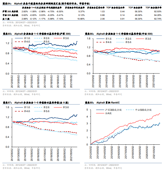 Alpha9 = ts_return(mul(CON_GPE, CON_CAGR), 60),因子先计算一致预期GPE和一致预期净利润2年复合增长率的乘积,再计算其过去60个交易日的变化率。该因子属于一致预期复合因子。图表63~图表68为Alpha9的测试结果。