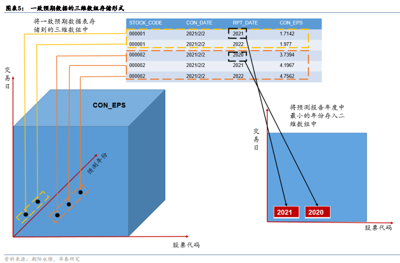 在使用遗传规划进行量价因子挖掘时,因子计算过程是在二维(第一维是股票,第二维是交易日)的量价数据上进行矩阵预算。而在进行一致预期因子挖掘时,情况变得更加复杂了一些,每日每只股票通常包括未来2-3个年份的预期数据,此时需要一个三维数据结构来存储数据,第一维是股票,第二维是交易日,第三维是预测年份,如图表5所示,我们把原始一致预期个股数据表中的数据依次填入到三维数组中。
