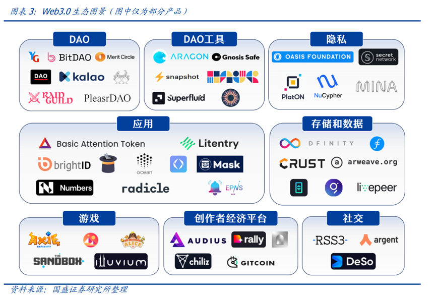目前Web3.0 生态已经初显雏形,除了DOA的技术基础架构以及DAO的解决方案外,国盛证券在报告中也从应用角度做了总结: