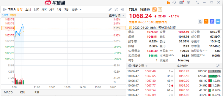 华盛资讯4月7日消息,大型科技股整体上扬,截至发稿,特斯拉(TSLA)涨2.15%,现报1068.24美元。