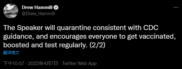哈米尔写道,“议长已完全接种疫苗,并接种了加强针……议长将按照(美国)疾控中心的指导进行隔离。”