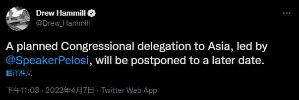 德鲁·哈米尔在最新更新的推文中宣称:“由佩洛西率领的国会代表团前往亚洲的计划,将推迟到以后的某个日期。”