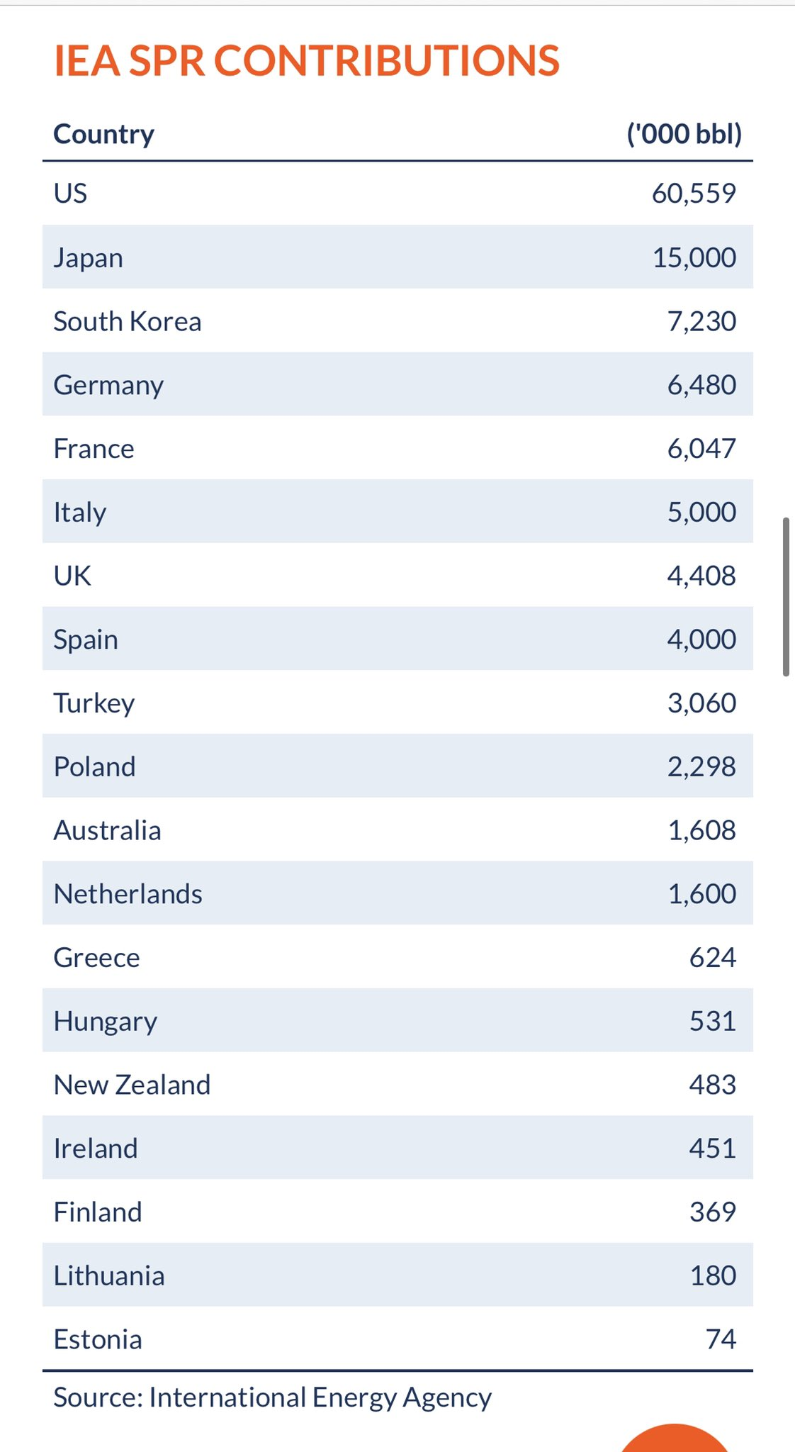据路透社报道,当地时间4月6日,国际能源署署长法提赫·比罗尔表示,计划联合成员国释放1.2亿桶石油储备,其中一半的6000万桶来自美国,另一半来自其他成员国。具体分配份额如下,