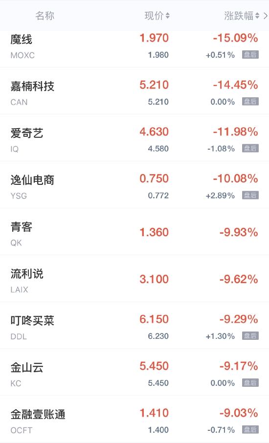 热门中概股周四收盘多数下滑,纳斯达克中国金龙指数收跌4.45%。