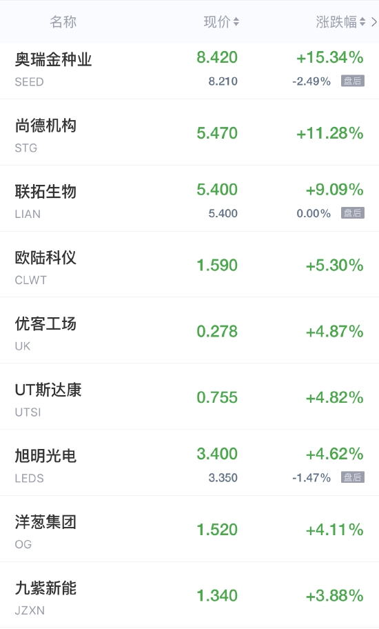 尚德机构涨超11%,洋葱集团、嘉银金科涨超4%,九紫新能涨近4%,搜狐涨超3%,第九城市涨超2%,途牛涨2%。
