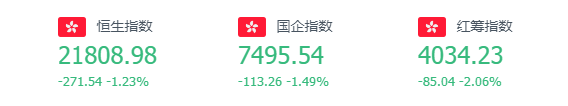 截至4月7日收盘,恒指跌1.23%,报21808.98点,海底捞跌超7%,领跌蓝筹。恒生科技指数跌2.48%,万国数据跌7.93%,快手跌近5%,哔哩哔哩跌超4%,京东、百度跌超3%。