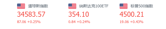 截至4月7日周四收盘, 道指涨87.06点,涨幅为0.25%,报34583.57点;纳指涨8.48点,涨幅为0.06%,报13897.30点;标普500指数涨19.06点,涨幅为0.43%,报4500.21点。特斯拉收高1.1%,特收跌5.4%,惠普收高14.75%。