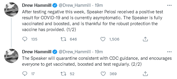 佩洛西前往亚洲之行已推迟,其发言人在社交媒体上写道:“佩洛西议长(刚刚)收到了新冠检测呈阳性的结果,目前无症状。议长已完全接种疫苗,并接种了加强针,议长将按照(美国)疾控中心的指导进行隔离。”