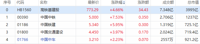 4月8日消息,港股以稳增长为代表的基建板块大涨。截至发稿,中国中铁涨近8%,中国铁建涨超5.95%,中国中冶涨超5%,中国交通建设、中国建筑国际均涨超2%。
