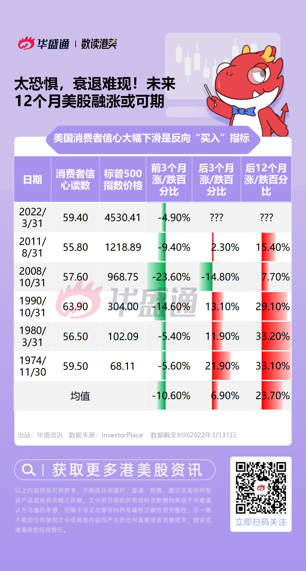 在上述提到5次情境中,有4次美股都在接下来的三个月里反弹了。这5次里股市都在接下来的12个月里反弹走高。数据显示,消费者信心大幅下滑后3个月股市的平均涨幅接近7%;后12个月股市的平均涨幅接近24%。