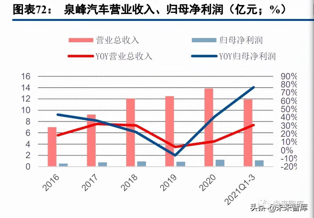国内市占率第一的铝压铸龙头,开拓国内新势力合作焕发新机遇。广东鸿图作为老牌铝压铸龙头企业,具 备良好的技术基础与客户储备,长期处于国内市占率第一的地位。2021 年 H1 公司铝压铸业务营收占比 63.6%, 主要产品包括动力总成系统、传动系统和新能源汽车结构件。2018 年,公司营收与净利均达到峰值,随后进入 转型探索期,净利率相对行业承压。2020 年,公司新能源与高精尖业务占比 21.78%,新开拓的新能源产品项目 按生命周期销售占比达 43%,当年净利同比增幅达 465%。2021 年 Q1-3,公司营收(43.49,同比+13.48%), 归母(1.92,同比+147.75%),持续保持业绩增长。2021 年,广东鸿图开拓小鹏、蔚来等国内新势力车企客户, 并与小鹏围绕一体化零件进行同步开发合作,为公司带来新的增长机遇。