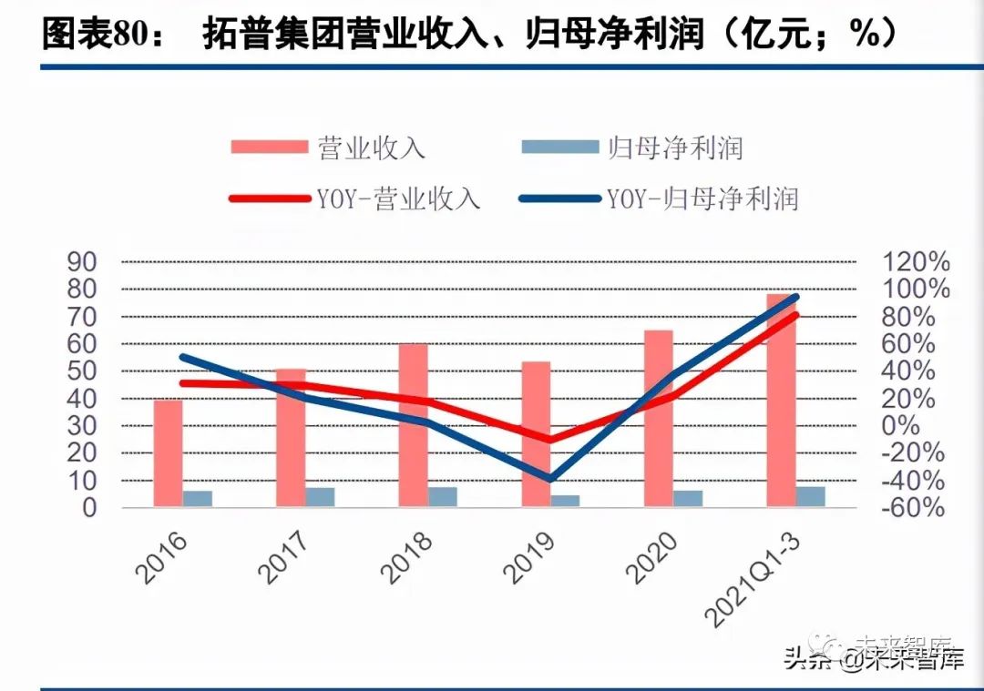 全方位产品布局,轻量化领域经验丰富。基于原有的 NVH 领域优势,拓普集团不断地进行研发投入,致 力于打造汽车减震系统、饰件系统、智能驾驶系统、底盘轻量化系统、热管理系统五大领域的产品矩阵。公司 凭借对市场变动的高敏感性与快速反应,获得大量传统与国内外新势力等主机厂订单,包括特斯拉、比亚迪、 长城、小鹏、上汽、长安等。其中,在轻量化领域,拓普逐步建立了一站式轻量化解决方案,已具备了轻合金 领域高压、真空压铸、低压、差压、挤压铸造、锻造的六大工艺,已量产的产品类型涵盖底盘系统、动力总成 结构件、电池包结构件、车身结构件以及热管理阀板等,并可为客户提供定制轻量化服务。随着新能源的超高 景气与车企的快速放量,2021 年 Q1-3 公司实现了营收 78.23 亿元、同比+81.1%,归母净利润达 7.53 亿、同比 增长 94.4%的高增长。