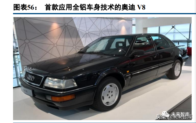 基于空间架构技术的研究,大众率先实现全铝车身量产。大众是全球率先尝试轻量化的车企,通过奥迪空 间架构技术(ASF)优化车架结构,并在关键部位应用超高强度材质,非承重部位使用轻量化材料来达到整车 轻量化的目的。大众集团不同品牌的市场定位不同,应用的轻量化材料各异:奢华跑车保时捷大量应用碳纤维 和铝合金材料;奥迪等豪华型车采用铝、镁合金等轻量化金属;桑塔纳等经济型车则采用高强度钢板代替传统 钢板。大众旗下奥迪是全球第一个实现全铝车身量产的车企,早在 1982 年奥迪就开始研究“高度铝制轿车”项 目,1987 年首款应用全铝车身技术的奥迪 V8 量产,1993 年法兰克福车展上奥迪 A8 横空出世,此后二十余年 逐步将全铝车身技术推广至其他车型。