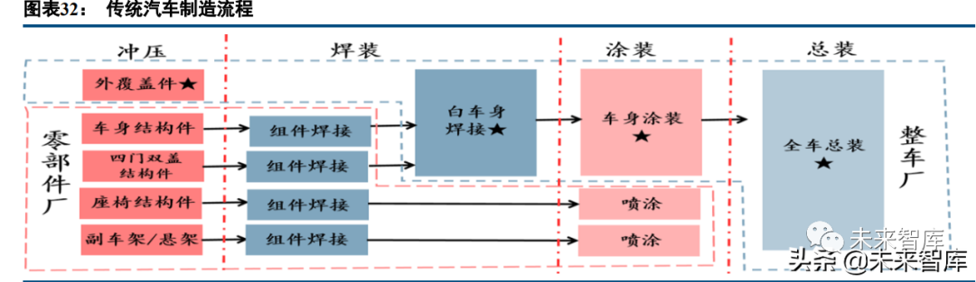 传统车身制造覆盖四大工艺,整车厂与零部件厂商分工合作。(1)冲压:借助压力机与模具将板材连续冲 压为小块钣金零件;(2)焊装:将冲压好的车身零件用夹具定位,采用装配后焊接的方法将其接合形成车身总 成(即白车身);(3)喷涂:喷涂油漆于白车身上,起到防腐蚀与装饰的作用;(4)总装:将车身、动力系 统、电控系统、内外饰等各零件装配生产为整车。传统车身制造的各项流程由整车厂与零部件制造商合作完成, 冲压环节分为整车厂冲压外覆盖件以及外部零部件厂冲压结构组件,由于结构组件的尺寸在 300mm 以下,一般 采用中小型压力机,而覆盖件尺寸通常在 800mm 以上需要大型压力机连续冲压。冲压环节完成后,零部件厂商 采用多个机器人组成焊点车间进行组件焊接,之后再送至整车厂与其生产的外覆盖件焊接成白车身,并进行涂 装和总装。相较于零部件厂,整车厂产线使用的压力机、模具、机器人远高于零部件厂,产线投资也更高。