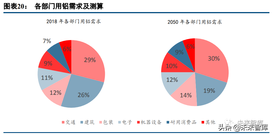 下游深加工应用广泛,交通部门(含汽车)用量最多。铝合金深加工的下游产业覆盖广泛,包括建筑建材、 交通运输(航空、汽车等)、电线电缆与食品医药包装等。交 通和建筑部门占比最高,分别为 29%、26%。其中,交通板块对铝的需求占比将会持续保持,且总量不断增加, 因而车用铝合金制造厂商的订单量受下游整车厂影响较大。此外,新能源单车用铝量普遍高于传统燃油车近 42%, 随着新能源汽车渗透率的提高,车用铝合金的市场规模将会不断扩大。