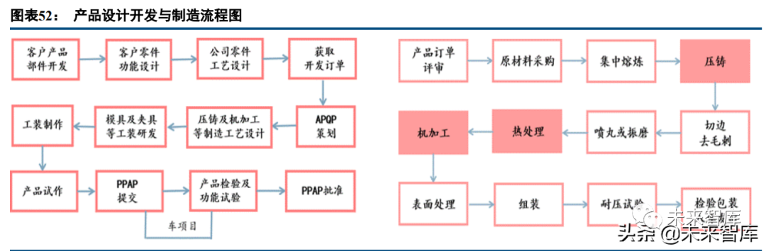 面向客户需求提供产品方案,研发能力成为重要竞争环节。随着一体化压铸技术的落地应用,因为一体化 压铸的大型产品相对小型铸件的结构更复杂,不同部位的需要满足的力学性能和要求的工艺参数也可能差异巨 大,所以在新产品生产前,压铸企业需要面向客户的需求深入参与到一体化产品的开发设计流程,即要参与到 产品前期的方案设计中,根据客户需求和产品要求对压铸工艺进行针对性的参数优化、模具设计和技术改造, 需要经过大量的试验论证和优化改造环节后才能通过生产批准程序并最终进入产品制造环节。是否具有独立开 发甚至同步开发的能力是汽车一级零部件供应商和整车厂商选择供应商的重要评审标准。产品开发环节是客户 与公司共同研发的过程,公司的技术研发能力成为核心竞争力之一,同时也是获取订单的重要手段之一。