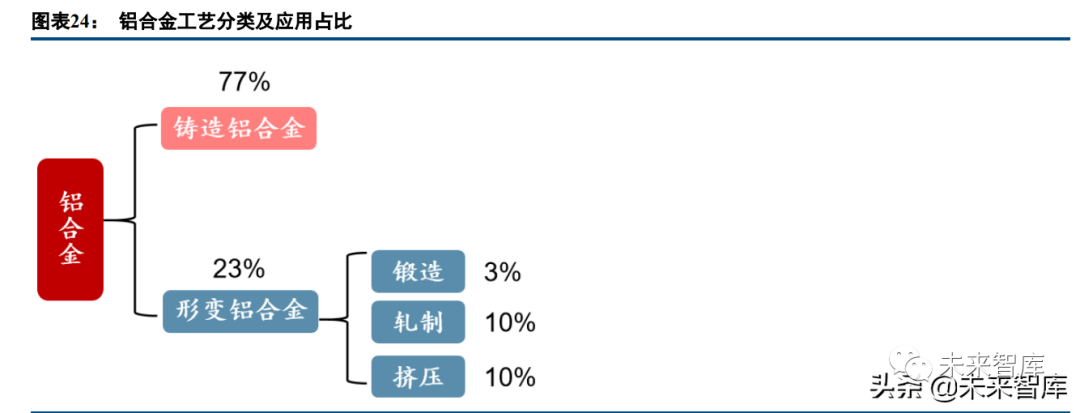 车用铝合金加工工艺分为铸造和形变,铝铸件在汽车用铝中占比最高。(1)铸造铝合金:将铝合金加热至 熔融状态,流入模具中冷却成型后加工成汽车零部件。铸造铝合金具有良好的导热性和抗腐蚀性,兼顾提高汽 车在纵向和横向震动中的性能。铸造铝合金被车企广泛使用在发动机气缸、汽车摇臂、轮毂、变速箱壳体等耐 久性要求高、结构更为复杂的位置。(2)形变铝合金:变形铝合金是指通过冲压、弯曲、轧制、挤压等工艺使 其组织、形状发生变化的铝合金。应用上,铸造铝合金一般用于结构更加复杂的部件,形变铝合金则适用于结 构较为简单、对机械性能要求更高的汽车部位。根据中国船舶重工集团数据显示目前汽车各类铝合金实际占比 为铸铝 77%,轧制材、挤压材各占 10%,锻造材最低,仅占 3%。