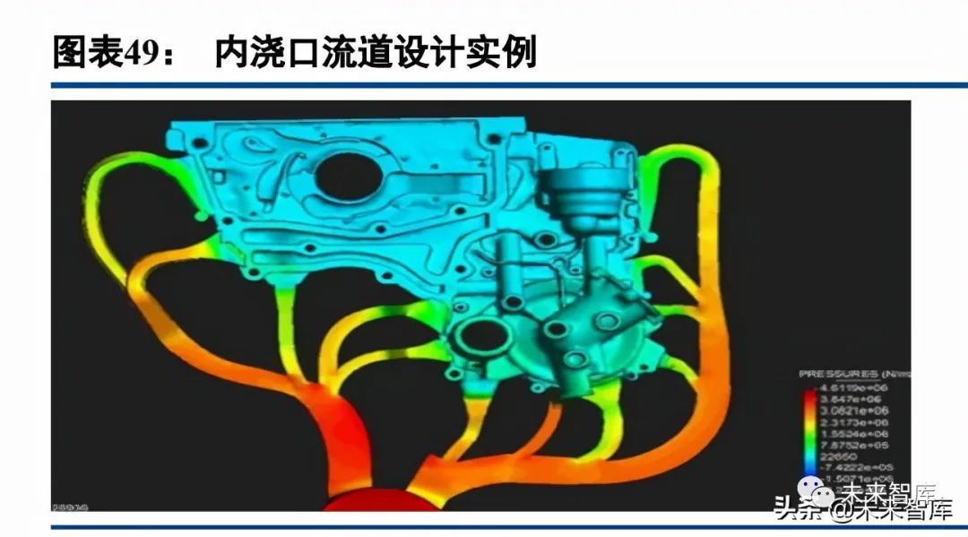 一体化压铸提高了模具壁垒,抗压力和形状设计要求激增。模具的设计与制造是生产一体化压铸件的重要 前端工序,随着压铸机锁模力的提高,一体化压铸件精度的增加以及压铸件“多合一”趋势带来设计复杂度的 上升,模具的角度、热流道和制造成型难度提升,导致模具的抗压力、和形状设计要求激增。(1)抗压力。一 体化压铸的锁模力增强,以前的压铸机锁模力大多在 5000t 以下,随着 6000t、8000t 甚至 12000t 压铸机的不断 普及,模具在工作时将会承受更多压力,从而造成损伤。同时,在金属熔炼和铸件脱模时,模具需要承受各种 维度的拉力和推力的影响,容易造成裂纹,影响模具的使用寿命。(2)形状设计。一体化压铸件往往是将多个 零部件一体化压铸成型,比如长城和比亚迪的“多合一”壳体,所以模具体积更大,金属流通通道更加复杂。在压铸过程中,金属液将在模具中流动,随着模具结构的复杂化,金属液容易在流动通道的转角处无法充分填 充造成缺陷,同时更加容易产生气泡对良率产生影响。